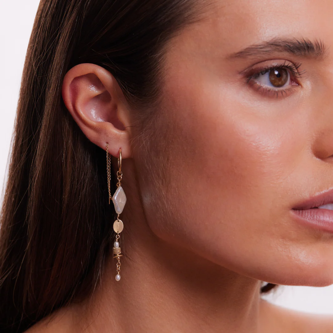A must have for Alana Maria Jewellery lovers. This distinctive design features a thread attachment with a large freshwater pearl centrepiece with a drop of flattened discs, textured beading and mini pearls. Perfect for beach-lovers, designed to be worn in two piercings or can be worn just with the mini hoop for an eye-catching look.